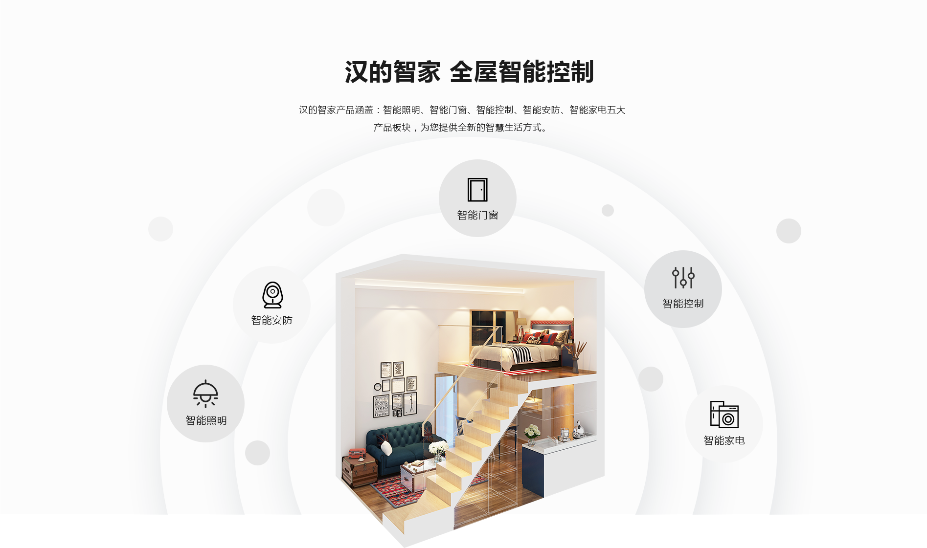 漢的智家產品涵蓋:智能照明、智能門窗、智能控制、智能安防、智能家電五大產品板塊,為您提供全新的智慧生活方式。